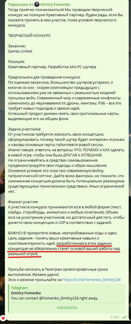 Перевожу: "Создайте нам хай-концепт игры. Денег мы за это не дадим; мотивация — ну вы же крутой, вам что, слабо? Может, мы возьмём результат в работу, может, не возьмём, вам отчитываться не будем".