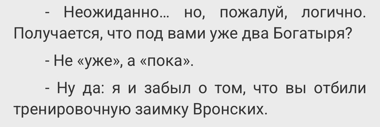 Пожелание автору. Лучше реже выкладывать, но куски повнятней-попитательней. Хотя бы 30К. Сейчас ощущение, что в прошлой главе был клиффхэнгер, а в этой он все ещё продолжается. Ну вот такое вот ощущение, как будто вместо нормальной еды покормили стаканом воды. Если оно не только у меня, то, возможно, сейчас отхвачу плюсцов, если нет, то наоборот :)