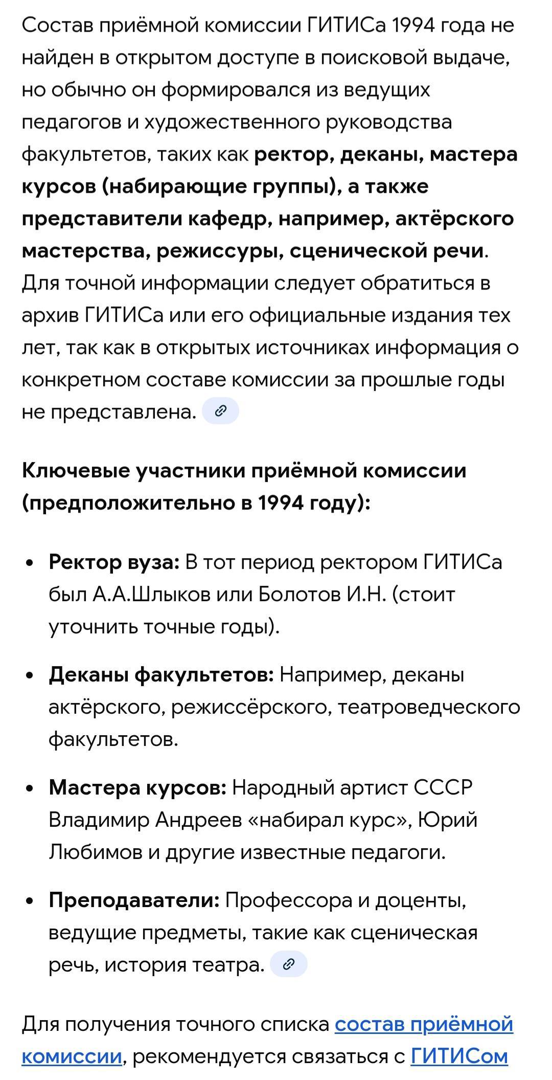 Спасибо, Денис! Реально сильная 11 глава. А, вот, если такой поворот- местное телевидение вело запись спектакля с профессионально записанным звуком, что очень важно, и Паша выкупил копию видеокассеты. ( ну, или они сами подарили актёрам по копии, на память). Я, думаю, это очень поможет Наташе при поступлении. Не нужны все эти туры, просто показать запись со второго акта, где выходит Наташа. Думаю все сомнения и вопросы у комиссии отпадут, тем более Пашка поможет их убедить посмотреть запись с помощью своего дара убеждения. И, если Наташа собралась в ГИТИС, то, смотрите какие люди в приёмной комиссии 1994 года.