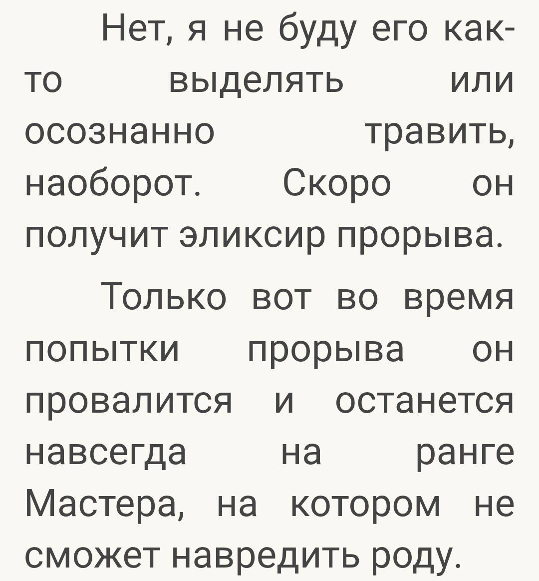 Заключение. Я понимаю что за книгу я читаю и она мне в целом нравится. Прямое как стрела русло повествования, с сучками-короткими вставками от лица других персонажей. Всегда какая-то короткая сцена, часто юмористическая или эмоциональная. Сцены эти мне нравятся. (добавлю что есть маленькая боковая веточка с Сергеем и там есть окошко чтобы раскрыть возню на слое обычный люд - мастер)