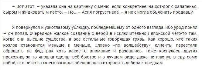 Японцы в большинстве своем не любят гайдзинов - это факт. Даже ГГ упоминает что это тут в порядке вещей. Тогда гг нужно всем зубы выбивать и проклятья насылать, зачем ограничиваться одним продавцом? Я не оправдываю продавца, упаси боги! Он сволочь и заслужил получить в морду. Меня больше именно поведение гг расстроило. Какая-то неадекватно агрессивная реакция на, по факту, отказ обслужить клиента. ИМХО Реакция поехавшего на почве собственной силы и безнаказанности психопата. Но это действительно спорный момент. Если вы считаете что гг поступил правильно  - ваше право.