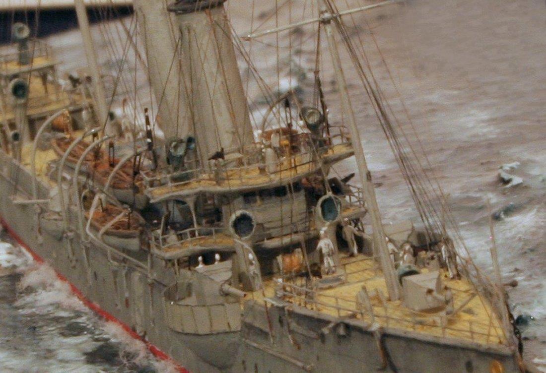 Ну и так если по мелочи: 120мм размещены очень плохо: одна 120 мм на полубаке (вместо мачты) лучше двух побортно. Торпедных труб мало. из 47 мм оставить 4 штуки на мостиках. Или даже лучше 2 шт на мостике.