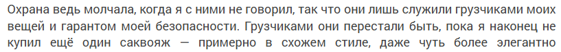 прекрасное произведение, но вставлю свое замечание; охранник никогда не возьмет что то постороннее в руки, даже портфель с ценными бумагами понесет секретарь, а не охранник. Если вы видите охранника с портфелем, то в нем не бумаги,а раскладной щит, или автомат.