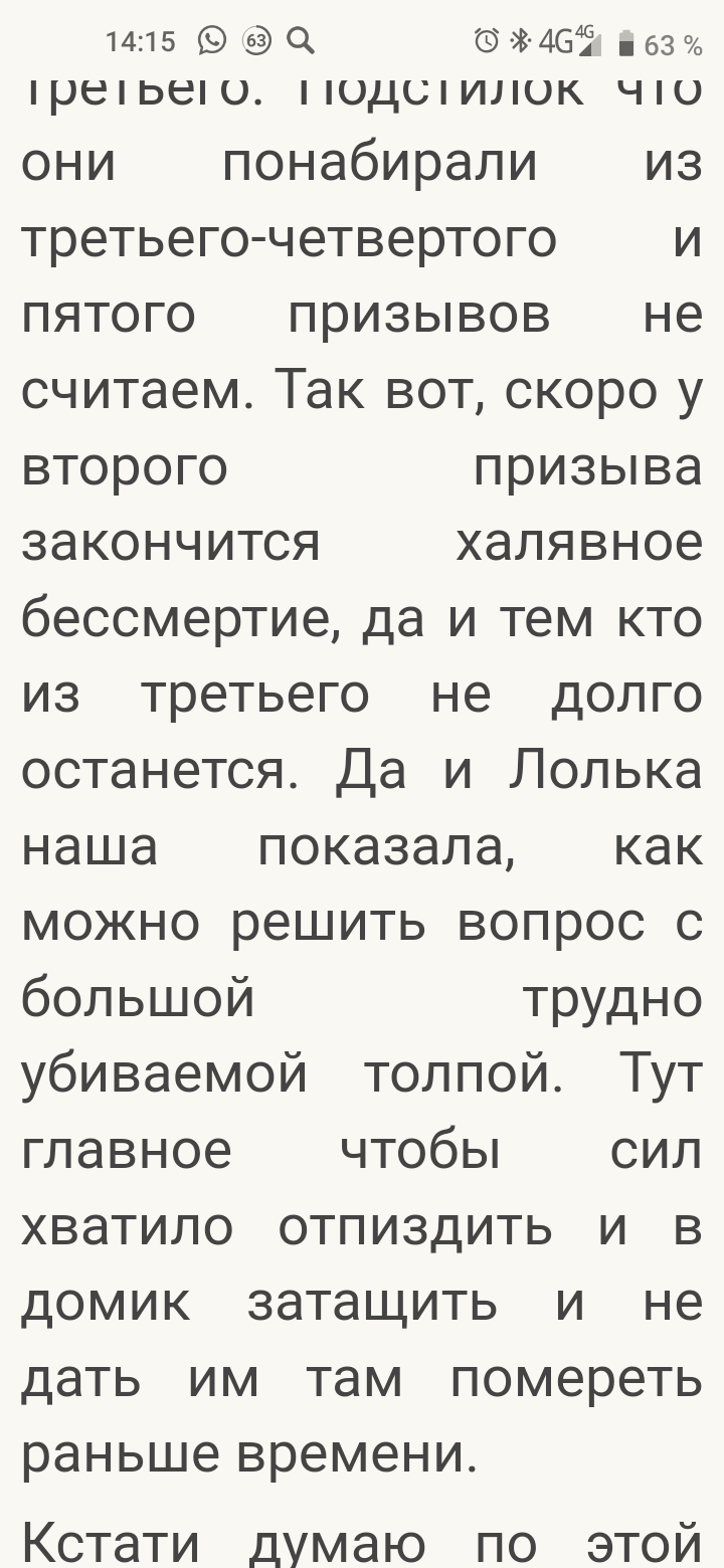 Не стыковка в сроках. Вы пишете что подходит срок окончания бессмертия у второй волны призыва, но если месяц 30 дней, а между волнами 10 дней, то их срок вышел в тот день когда Лолька появилась.