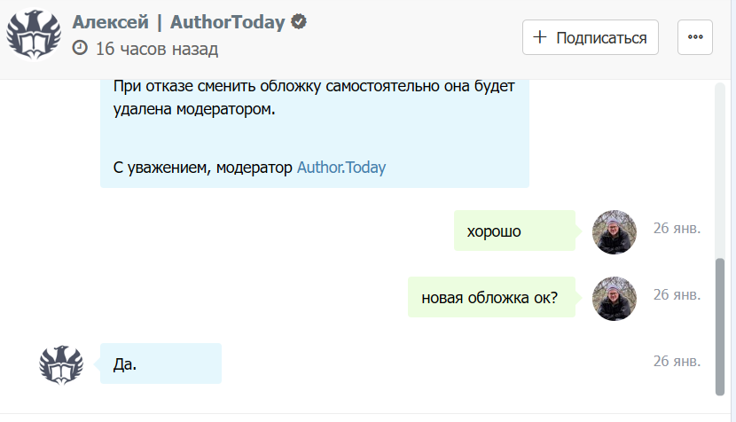 хотел поправить, мне сказало сообщение что вы часто меняли обложку и теперь поменять можете через сколько-то там. можно попробовать. но я думаю что в этом случае никто мне ничего не предъявит, т.к. непосредственно администрация АТ сказала ок. Исключение, подтверждающее правило - тоже вариант.