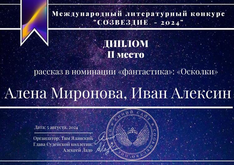 Третий совместный рассказ неожиданно(Но очень надеялись) принёс −1 место и приз — шикарная озвучка от Александра Башкова Три совместных рассказа, и все три отмечены в разных номинациях по возрастающей. Вместе мы сила!
