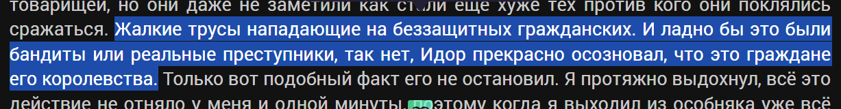 Это не в упрёк произведению. Просто меня всегда цепляют двойные стандарты. Такая гаденькая точка зрения. Типа вы все гады, а я принц справедливости. Вам нельзя, а мне можно, потому что я герой. И подобное. Когда герой утверждает, что он сдержан, что у него железный самоконтроль и сила воли.. А потом он начинает всех причастных гасить, потому что он обиделся, ему не понравилось. Будучи полубоого игроком сотового уровня рассуждать о том, что нельзя мучить и убивать слабых. И начать убивать 10 уровней. Ну тупо, потому что. У них там как бы рабство. Эти дети-это его имущество. Да, некрасиво. Да, общество осудит. Ну, это его право.