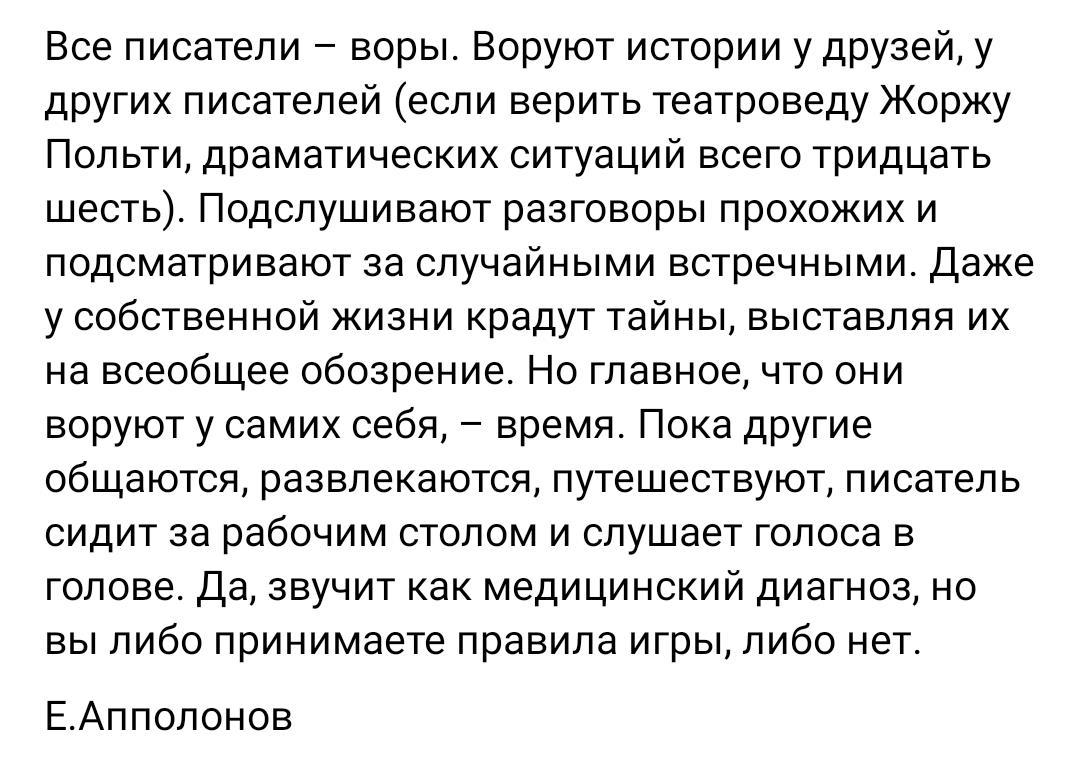Согласен и про перемену деятельности, и особенно про несочетаемость редактуры и творчества. Это же принципиально разная деятельность: в первом случае проверяется соответствие логике, сюжету, фактам, т.е. неким правилам и нормам. Во втором желательно все правила и границы смести. Я свои тексты тоже могу либо писать, либо редачить (ну, научпоп или документы приходится иногда одновременно то и другое, но там немного отличается от художественного текста). Даже у кого-то правило такое читал, мол НИКОГДА не перечитывайте то, что написали вчера, если хотите что-то написать сегодня: либо пишите, либо редактируйте.