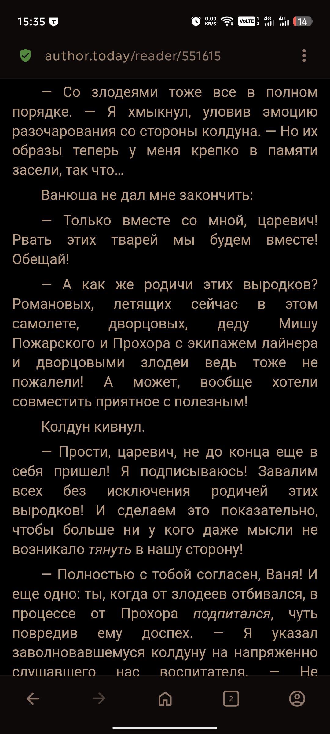 Они не могли пожалеть. Этого разговора не могло случиться между 2 оперативниками. Более того. есть такая вещь как связь слов в тексте. Между выродками Романовыми нет ничего. А значит это одно и то же. Точнее получается. Что алешенька колдуну кивает на каких-то выродков у которых в родне Романовы. деда Миша и далее по списку. То есть он кивает на своих братьев и называет их выродками. Намекая колдуну, что глушить злодеев сейчас никак и сначала нужно порешать вопрос с родственниками выродков. После чего идёт к царственному деду. Это Вы не читали, что именно написал ии. Ну или автор тупо накосячил. Но в такое я не верю