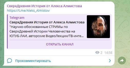 Тож предлагаю, делиться Знаниями ! !!! У меня основные проекты по продвижению ЗНАНИЙ - Космобродилка - https://author.today/post/138500 и Телега : https://author.today/post/727912 - СверхДревняя История от Алекса Алмистова - "Научно-обоснованные СТРИМы по СверхДревней Истории Человечества на ЮТУБ-ЛАИ, авторские ВидеоЛекции/ТВ-интервью и Историко-Фантастические книги (Атлантида Сумрачного Солнца) Алекса А. Алмистова (вопросы и ответы)" - https://t.me/Aleks_Almistov