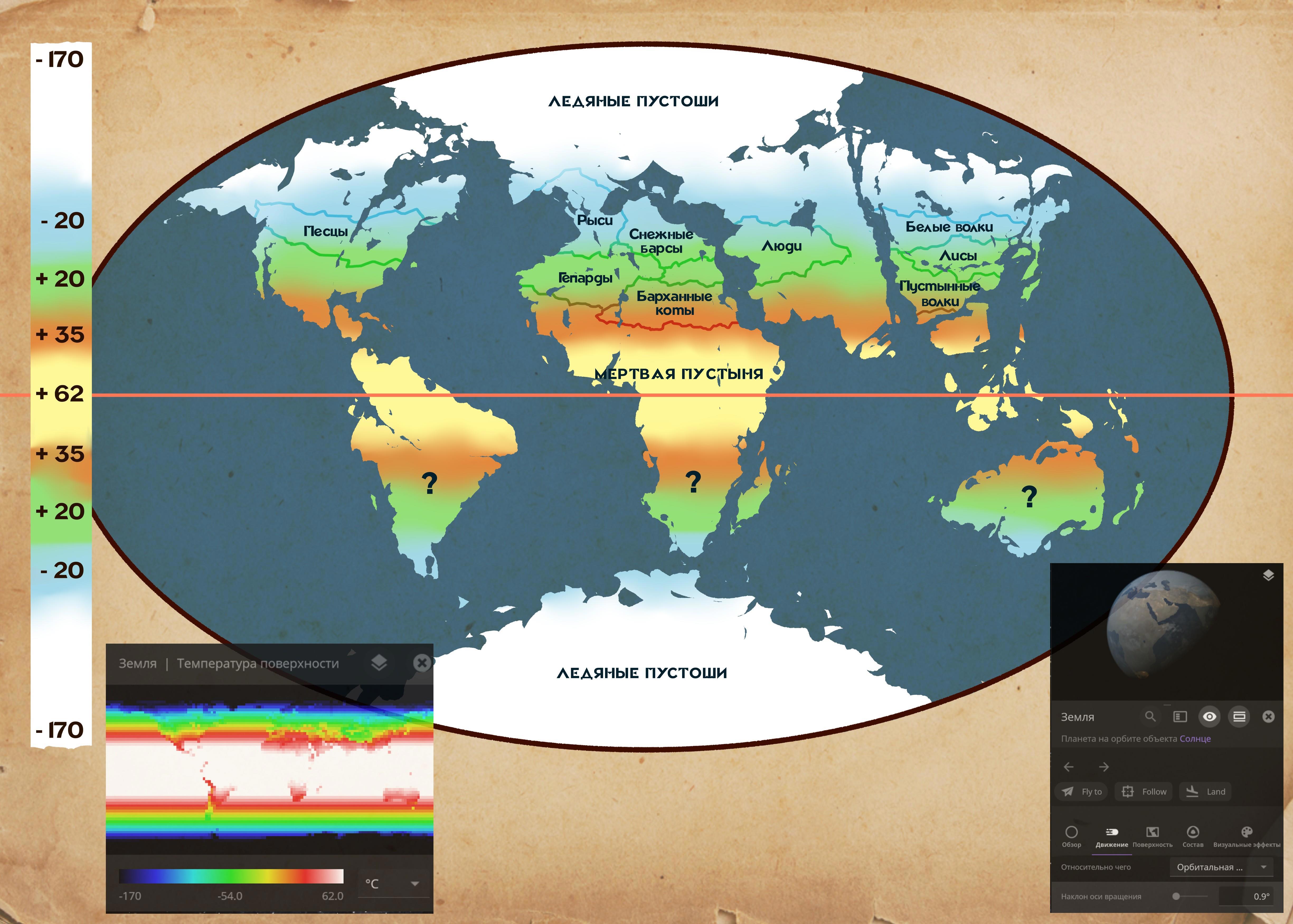 Спасибо за замечание, но, честно говоря, не понял, почему вы так решили. Изменился не угол экватора, а угол наклона оси вращения планеты в результате образовавшихся после взрыва бомбы, построенной на основе четвертого измерения, "сфер пустоты", что привело к смещению центра масс. Подробнее об этом во второй главе. Модель изменений была проработана в Universe Sandbox. Климатических в том числе.