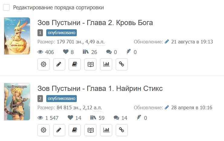 Книга еще не закончена, выкладываю её по главам согласно рекомендациям сайта. Первая и вторая главы готовы. Видимо, надо снять у них статус "в процессе", чтобы не путать людей) Я здесь еще не очень освоился, извините. Думал, что указать в названии книгу и номер главы будет достаточно для понимания. Иерархия такая: цикл "Четыре племени" → книга "Зов Пустыни" → глава 1, глава2, и т.д.
