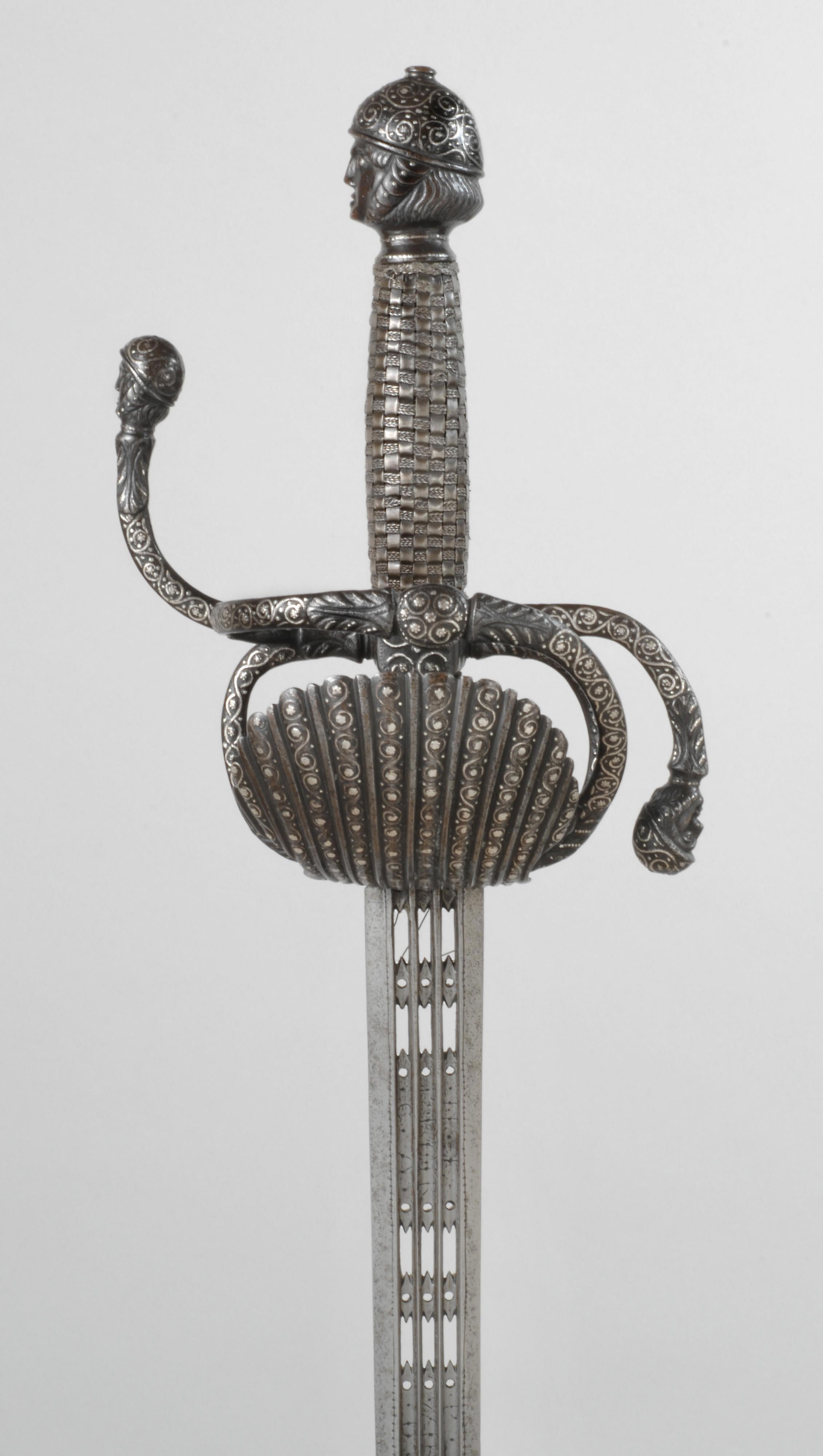 Рапира с эфесом типа swept hilt, начало XVII века. Эфес южногерманской выделки. Клинок работы знаменитого клинкового мастера из Толедо Томаса де Айала (ок. 1570-1625). Являвшегося официальным оружейником (espadero del rey) испанского монарха Филиппа II. На рикассо рапиры плохо читаемый штамп-клеймо, возможно это знак оружейной гильдии Толедо. В доле клинка, с обеих сторон надпись: * TOMAS * AIALA *. Оружие из собрания Венского Kunsthistorisches Museum, инв. A1028