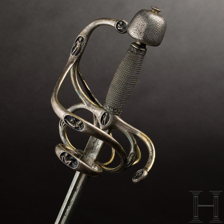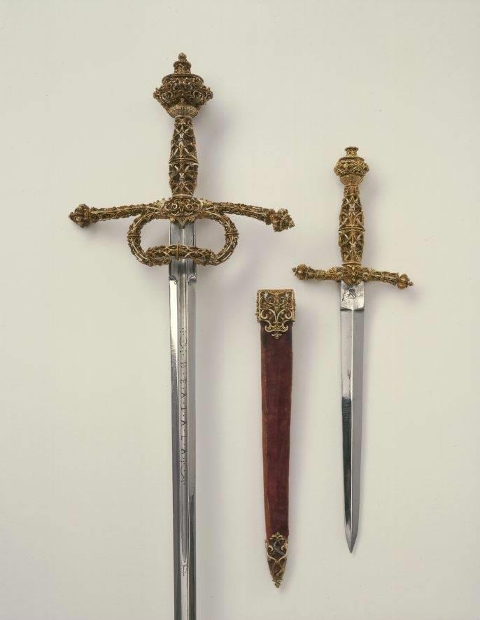 Гарнитур из рапиры и кинжала в люксовой отделке. Это подарок императора СРИ Максимилиана II герцогу Саксонскому Августу в 1562 (по другим данным в 1575 году) году, в честь его избрания курфюрстом. Длина рапиры 1198 мм, длина клинка 1048 мм, вес 1179 грамм. Эфес отделан золотом и эмалью. Клинок старше эфеса и вероятно является работой знаменитого мастера из Толедо Томаса де Айала. На клинке, в доле, надпись: DE TOMAS \ DE AIALA. Рапира из собрания Rüstkammer в Дрездене, инв. № VI 0416