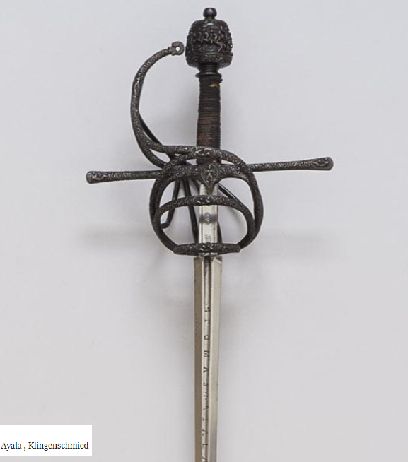 Рапира с клинком работы знаменитого мастера из Толедо Томаса де Айала. Томас де Айала (ок. 1570-1625) выдающийся клинковый мастер почти 30 лет поставлявший клинки для двора Короля Испании Филиппа II. C 1600 по 1625 годы де Айала носил почетное звание espadero del Rey. Клинки этого бесспорно выдающегося мастера из Толедо хранятся в крупнейших музеях мира.