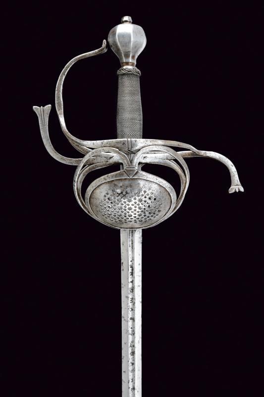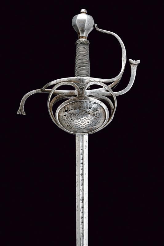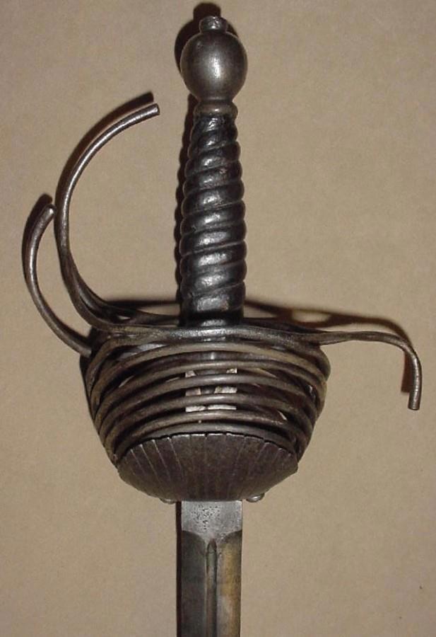 Эта рапира, изготовлена ориентировочно в 1620 году, в Италии. Гарда рапиры характерна для итальянского оружия, и почти не встречается в работах мастеров из других стран. Это так называемая "многокольцевая", или "скелетная" гарда. Почему она так называется прекрасно видно на фото. Как правило число защитных парных колец гарды было нечетным - 7,5,3. В данном случае это семикольцевая гарда. Оружие имеет общую длину 1263 мм, при этом длина клинка 1028 мм.