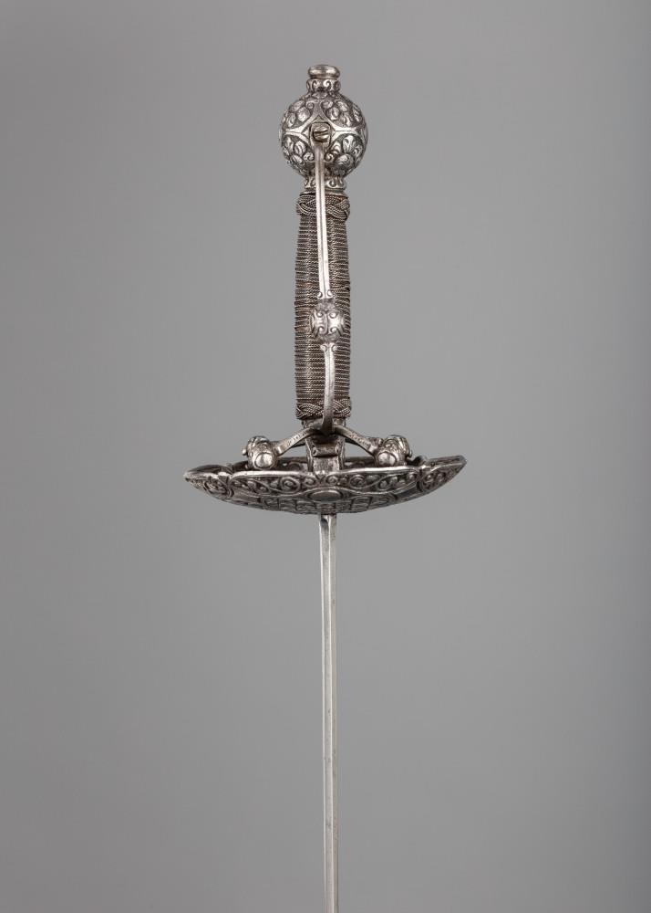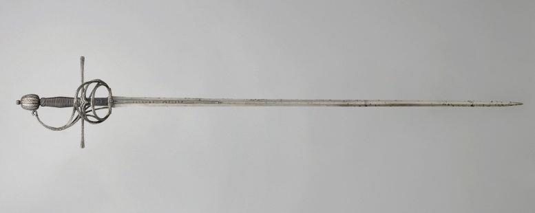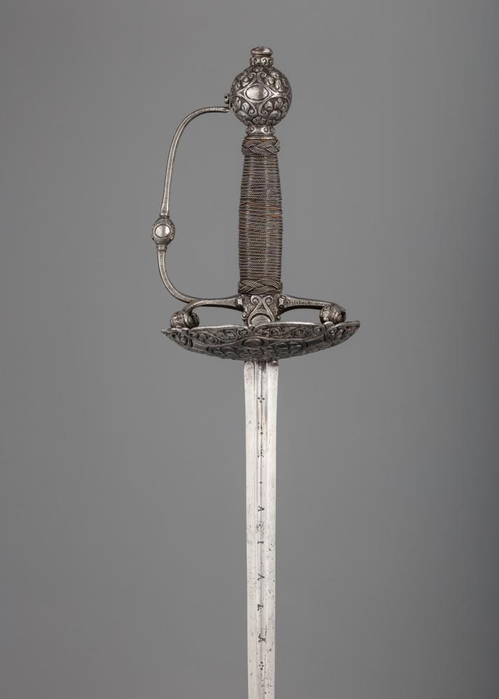 Рапира с эфесом swept hilt, ориентировочно 1635 года изготовления. Посеребренный эфес - Северная Европа. Клинок вероятно работы Томаса де Айала. Общая длина оружия 1364 мм (53 in). В доле клинка надпись: 'DE TOMA DE AIALA'. Из собрания Victoria and Albert Museum, инвентарник M.148-1921