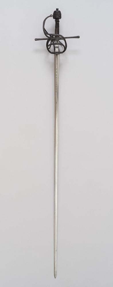 Рапира с клинком работы Томаса де Айала, espadero del Rey. Примерно 1610-1630 годов изготовления. Длина общая 1273 мм, длина клинка 1100 мм, ширина клинка у гарды 28 мм, вес 1340 грамм. На клинке надпись ‘·DE TOMAS · DE AIALA·’ и клеймо королевского арсенала Франции.