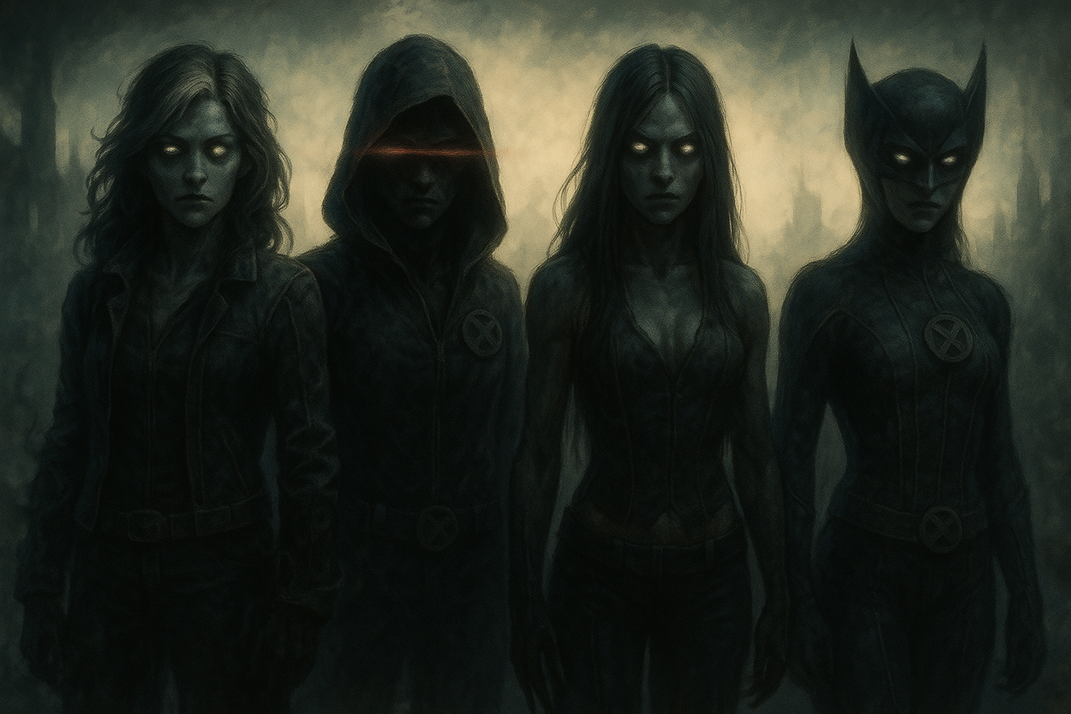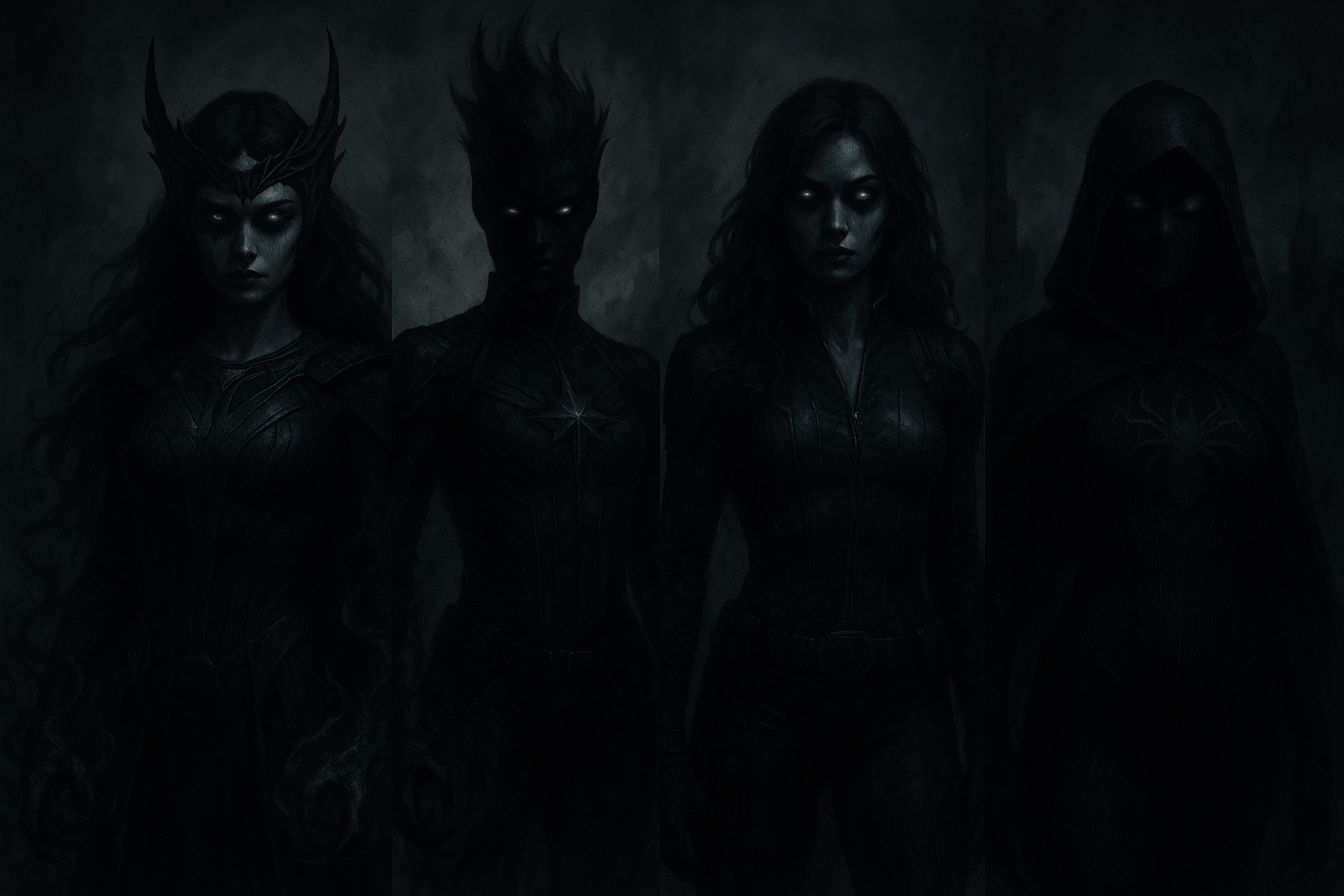 Если кто не увидел. Слева направо: Алая ведьма, Марвел, Романова, и походу Гвен -паук.