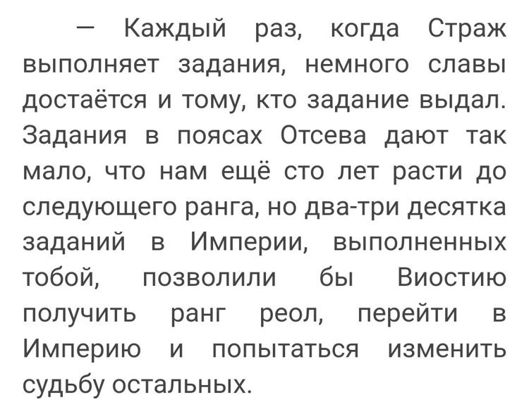 Меня вот во всем цикле очень нравится "реалистичность", в плане реально угрожающих опасностей и везения на грани, без прям роялей и с легким преневзмоганием. Т.е. когда герой не всемогущ и хочется верить что риск был, но и без мерисьюизма. Конечно, не игропрестольный уровень "реалистичности", когда какой-нибудь ключевой персонаж может внезапно ослепнуть / лишиться руки / умереть, но все равно высокий. И вот последняя глава тут подкачала, мне кажется, там слишком высок разрыв по звездам с противником был. И в такую легкую победу не верится.