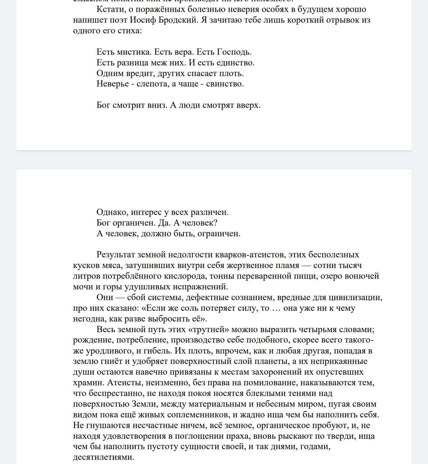 Отказался от работы с этим редактором, после того как она, забыв о том что работает за деньги с вымышленным текстом, стала возмущаться тем, как я пишу об атеистах (в скрине). И, кроме этого, додумалась журить меня за то, что много страшностей в моих текстах... Мне это зачем? Я заплатил и хочу результат, а не того, чтобы слышать недовольство, что в моих текстах много ужаса. Кстати, вся переписка с данным редактором у меня есть (если кто-то додумается заявить что я огульно ругаю эту даму).