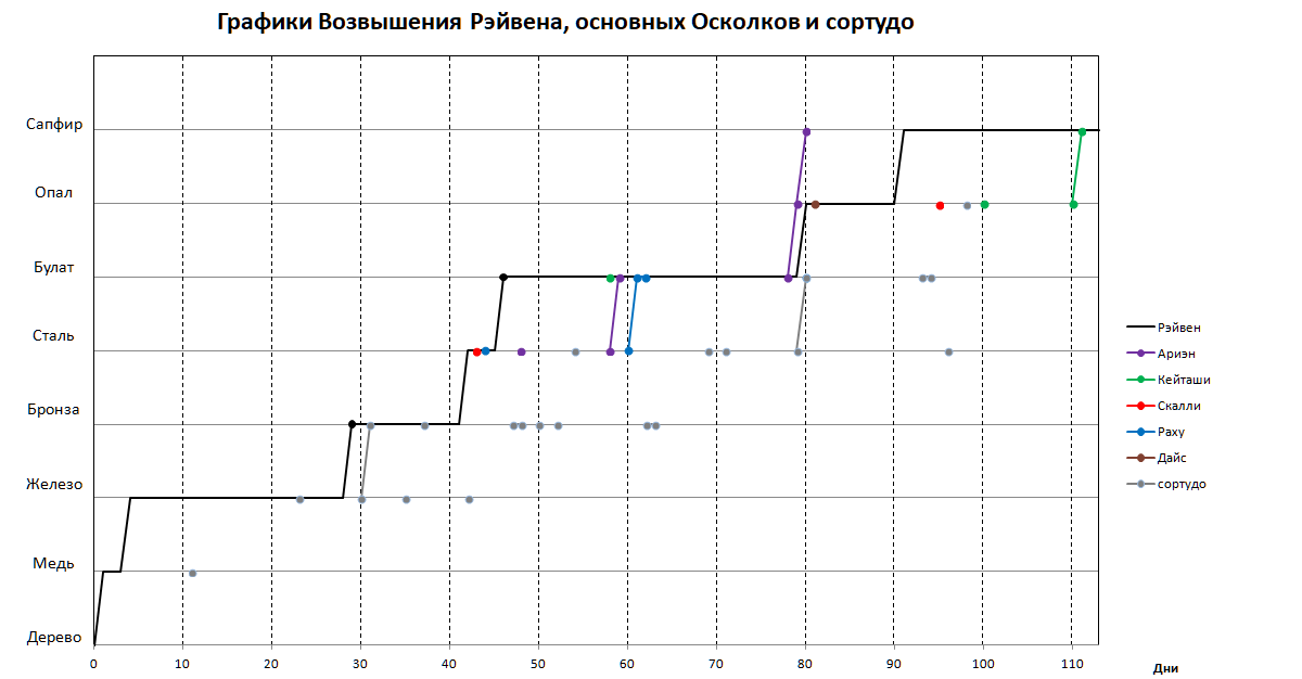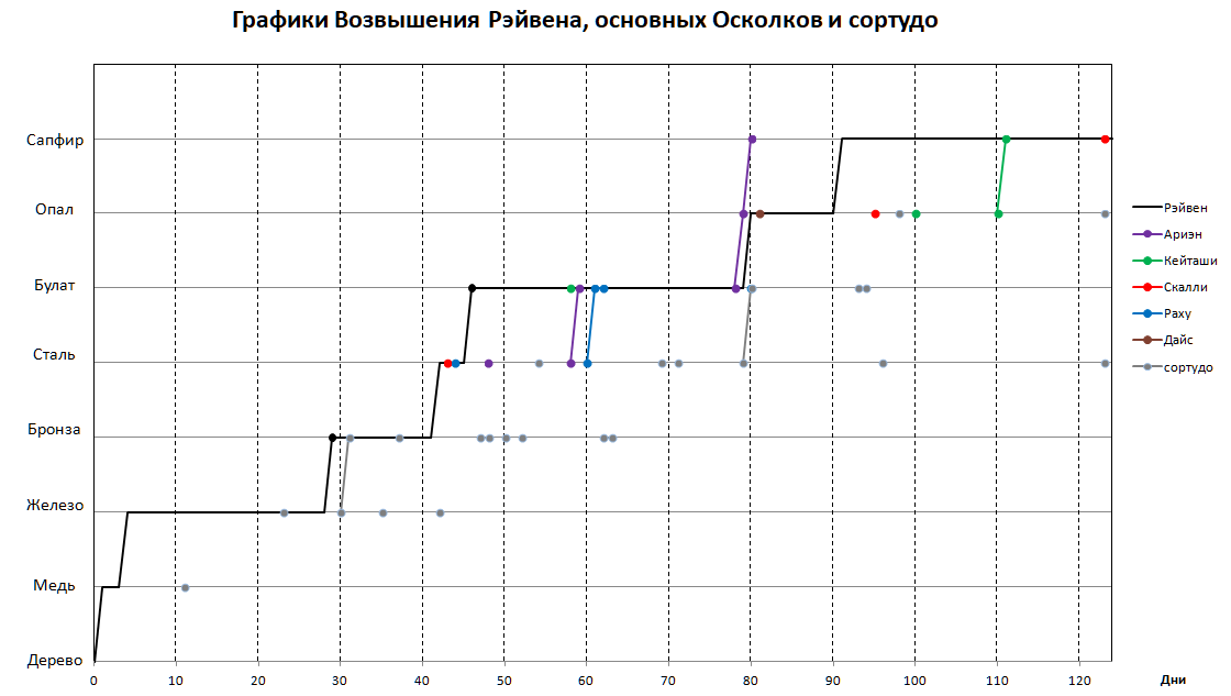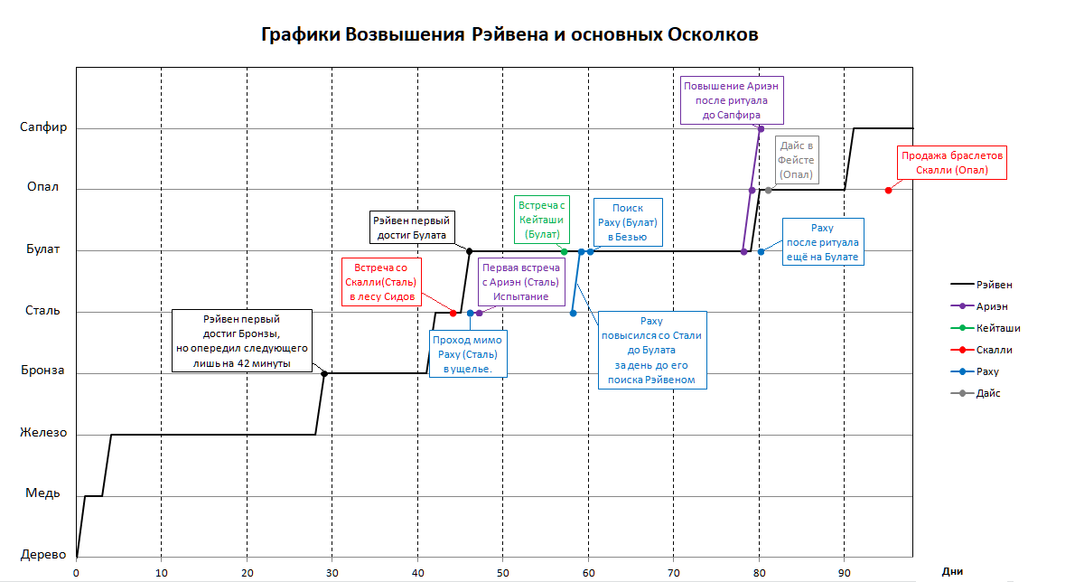 Я обновил график возвышения Рэйвена и основных Осколков. Информацию брал отсюда https://author.today/post/685416 Для Рэйвена идёт ломаная линия, для других - кружочки (чтобы строить линии для других - слишком мало точек)