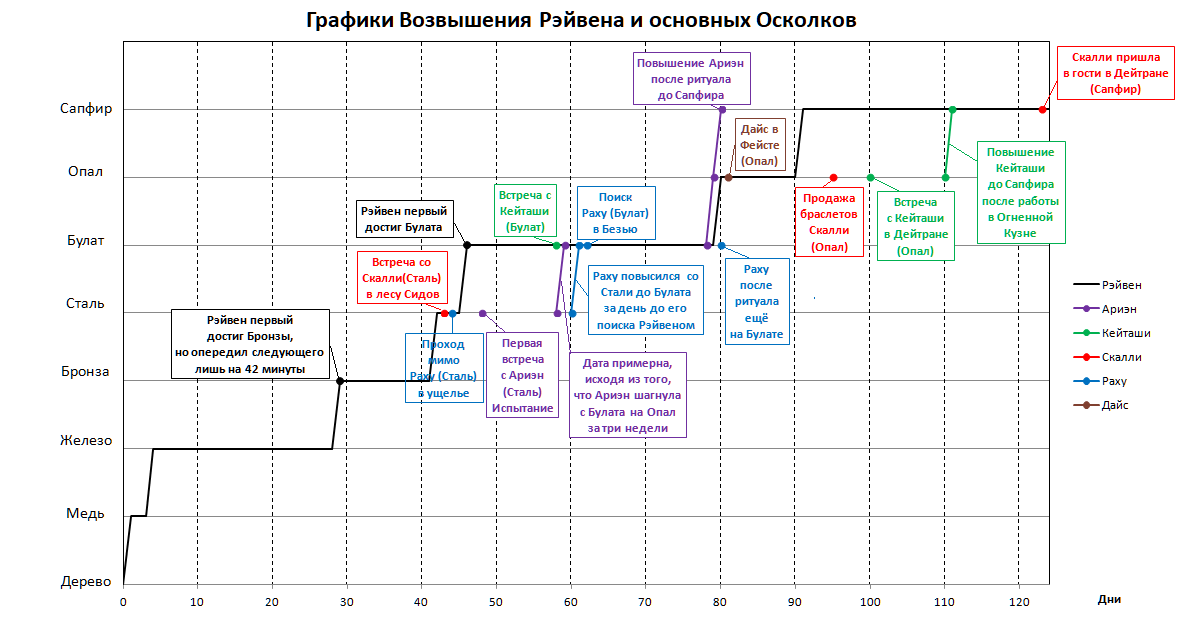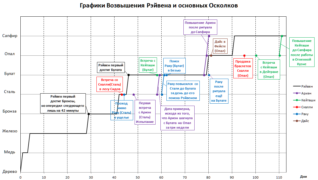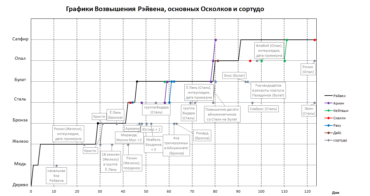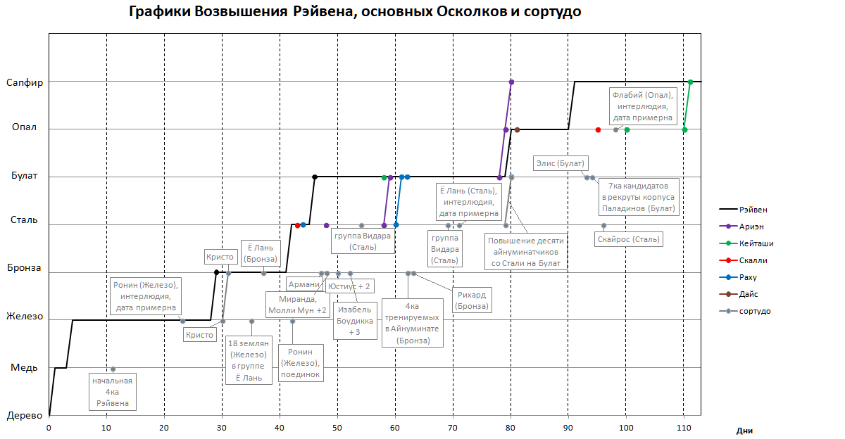 Раз окончание тома - то я обновил график возвышения Рэйвена и основных Осколков. Информацию брал отсюда https://author.today/post/685416 Для Рэйвена идёт ломаная линия, для других - кружочки (чтобы строить линии для других - слишком мало точек)