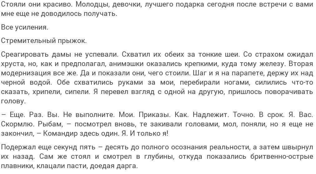 Необходимо, всё таки пояснить, выше было мое пожелание к автору - не опускать Гг на уровень хантеров. В первой книге это отлично получилось, поэтому подписался на вторую часть. Гг, по сути, уже стал имбой, за счет собственного пути прокачки, кучи ИО, артефактов и даже сыворотки правды. Фактически, выше кураторов для него соперников пока нет, и естественно для достижения своих целей используется самый простой, но не самый правильный (имхо), путь грубой силы: оглушение - ласточка (пытки) - сыворотка правды и всё это сдобрено ненужным матом, прикрытым "мля". Разве Гг отрицательный персонаж, типа Петрович? Не хотелось бы такой развязки сюжета, поэтому и написал комментарий. Но это относится только к последним главам проды, и автор может учесть пожелания в дальнейшем, либо не учесть.