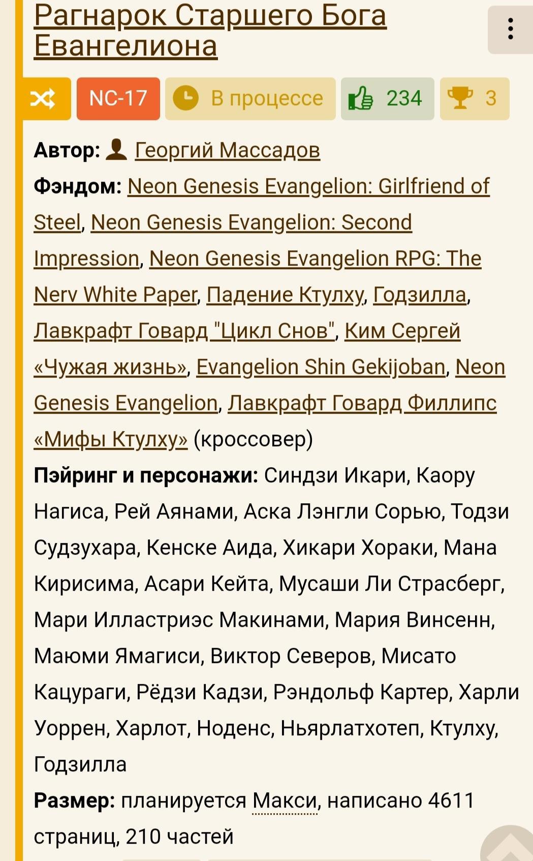 Начал читать давно,но потом автор "умер", хоть потом переодически чекал произведение , но во время разборки библиотеку пометил как прочитанное. А вот недавно снова набрёл на это произведение. Первую четверть все шло со крипом ведь нахер все забыл но потом начал вспоминать и влился , дочитал оставшиеся с удовольствием. Хотя из-за перерыва прошлые книги совсем не чувствуються и впечатления слегка смазались.