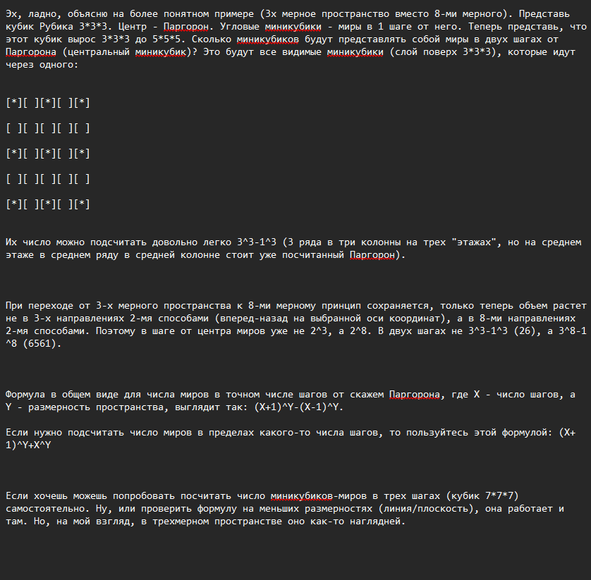 Паргорон - 1 мир. Шаг от Паргорона 2^8-0^8=256. Два шага от Паргорона 3^8-1^8=6560 (1^8 - это поправка на то, что часть из этих шагов из миров в шаге от Паргорона приходятся на сам Паргорон, а его мы уже посчитали). Три шага от Паргорона 4^8-2^8=65280 (та же поправка но уже на миры в шаге от Паргорона).