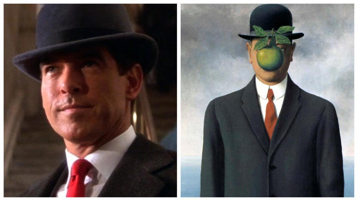 В фильме, когда Пирс Броснан крадёт картину, по музею дефилируют десятки одинаково одетых людей. Собственно и вор одет точно так же. Одеты они в пальто и котелок, подобно персонажу украдаемой картины.