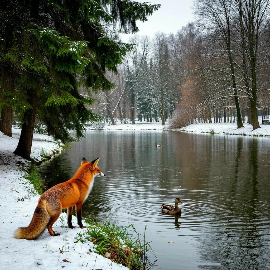 Ещё не время улетать, а Лиса пришла когда все улетели и Серая Шейка осталась одна.