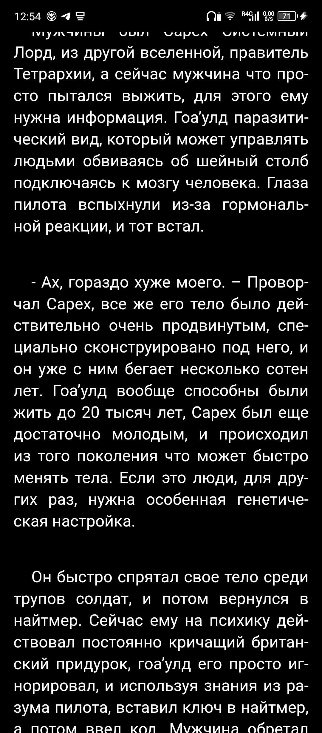 Глава 7:Сарех вспоминал как сражался в(убрать "в") битвах во своей вселенной, как он карабкался в по пирамиде власти гоа’улдов.