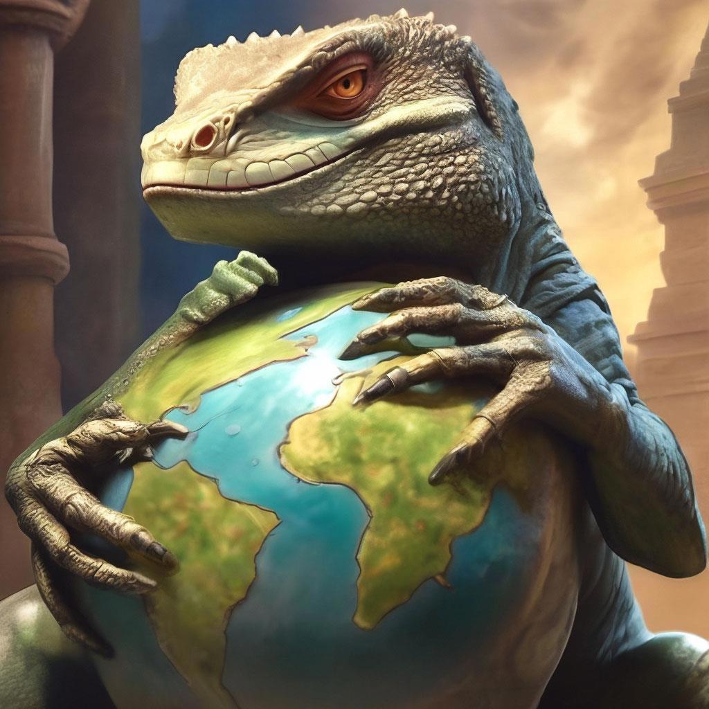 Промт был такой (по памяти) - антропоморфный ящер держит в руках земной шар, тайный заговор, рептилоиды.