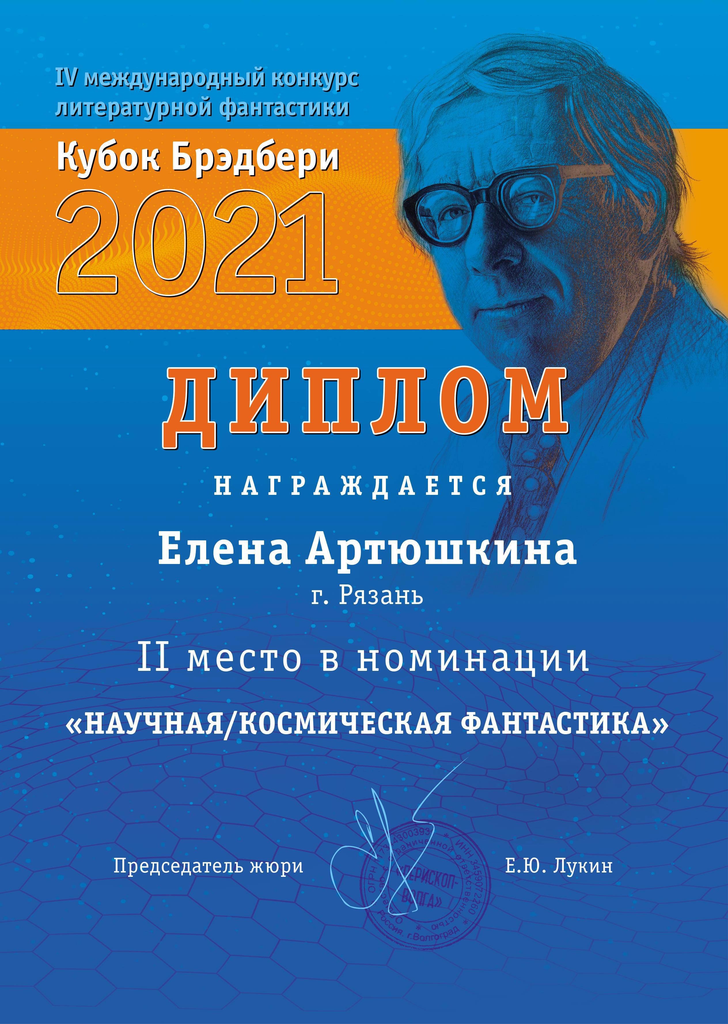 - Рассказ «Сон Божий» — второе место в номинации «Научная фантастика», IV международный литературный конкурс «Кубок Брэдбери — 2021»;