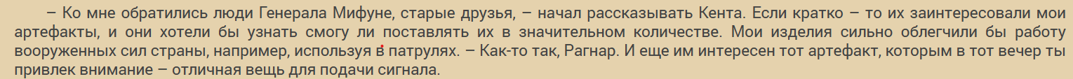 P.S. Да, кстати, пока писал комментарий, заметил косяк: в этом отрывке повествование ведётся от 3-го лица, а в абзаце-реплике от лица Кенты присутствует словосочетание "мои артефакты". Конечно, понятно, что речь идёт об артефакта Рагнара, вот только дойти до этой мысли получается не сразу - это не есть хорошо. Опять же, повторюсь, до этого повествование от 3-го лица, а тут внезапно 1-ое... без указания, что это реплика персонажа, то есть "слова автора".