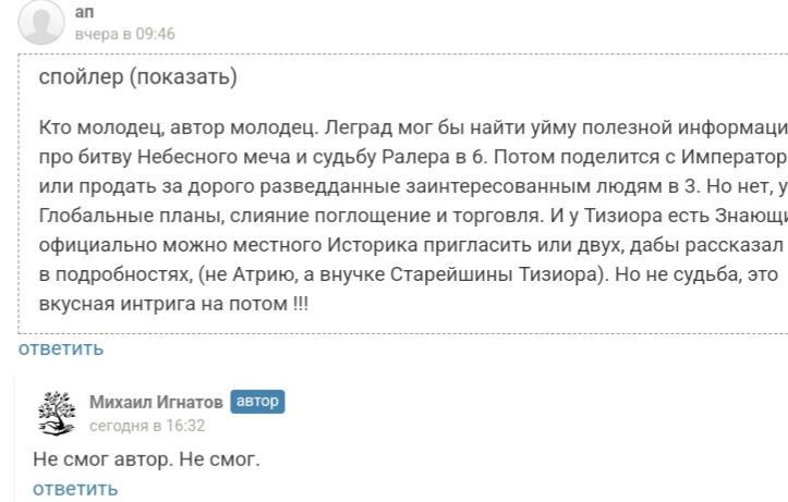 Кто молодец, автор молодец. Леград мог бы найти уйму полезной информации про битву Небесного меча и судьбу Ралера в 6. Потом поделится с Императором или продать за дорого разведданные заинтересованным людям в 3. Но нет, у нас Глобальные планы, слияние поглощение и торговля. И у Тизиора есть Знающий и официально можно местного Историка пригласить или двух, дабы рассказал все в подробностях, (не Атрию, а внучке Старейшины Тизиора). Но не судьба, это вкусная интрига на потом !!!