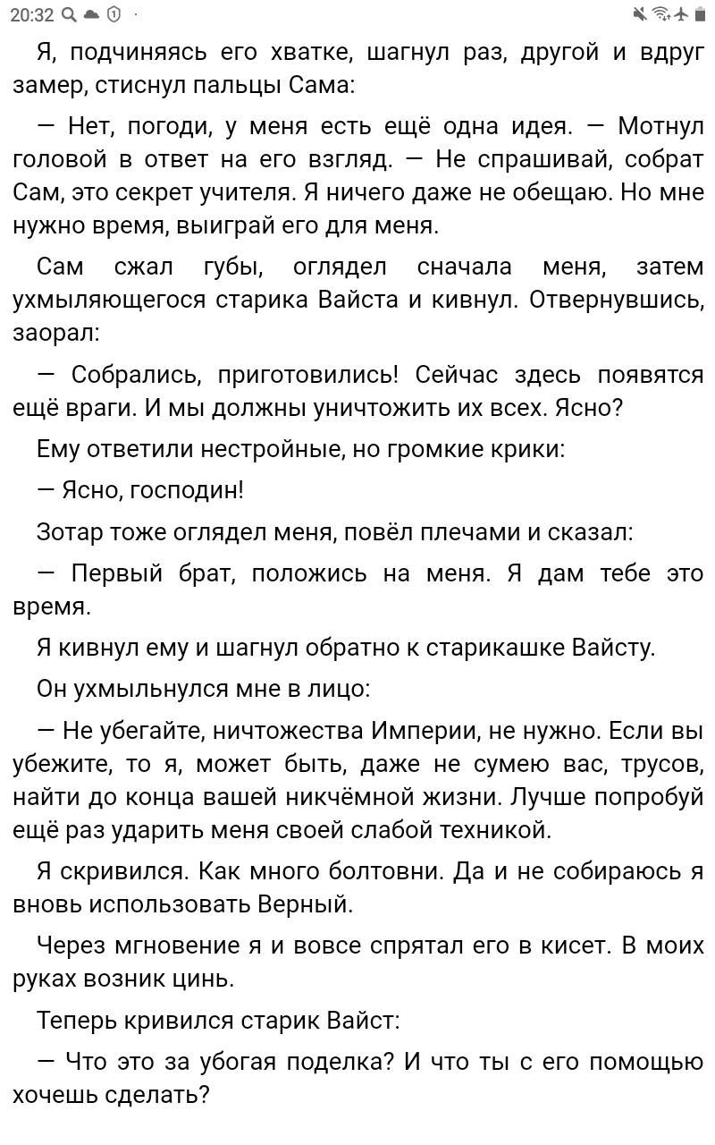И вернулся Леград в Исток. И заперся в самом защищенном месте. Неделю молчал и перекрашивал своих змеев в Зеленый ( брагой мозголомной). Преодолев все 5 линий защиты подходит к нему Старый дед и говорит" намудрил ты внучек с защитой" и пытаясь отвлечь от тяжких дум начинает про себя рассказывать!!! Но тут по закону жанра НАПАДЕНИЕ! И рассказ продолжается через 19 глав, с вопроса заданного Леградом, -"а как ты Старый ловушки и формации обошел?"