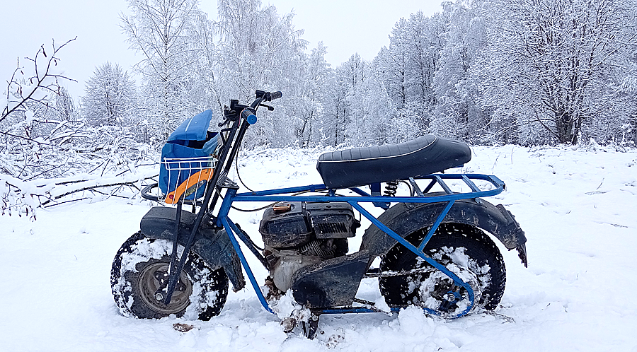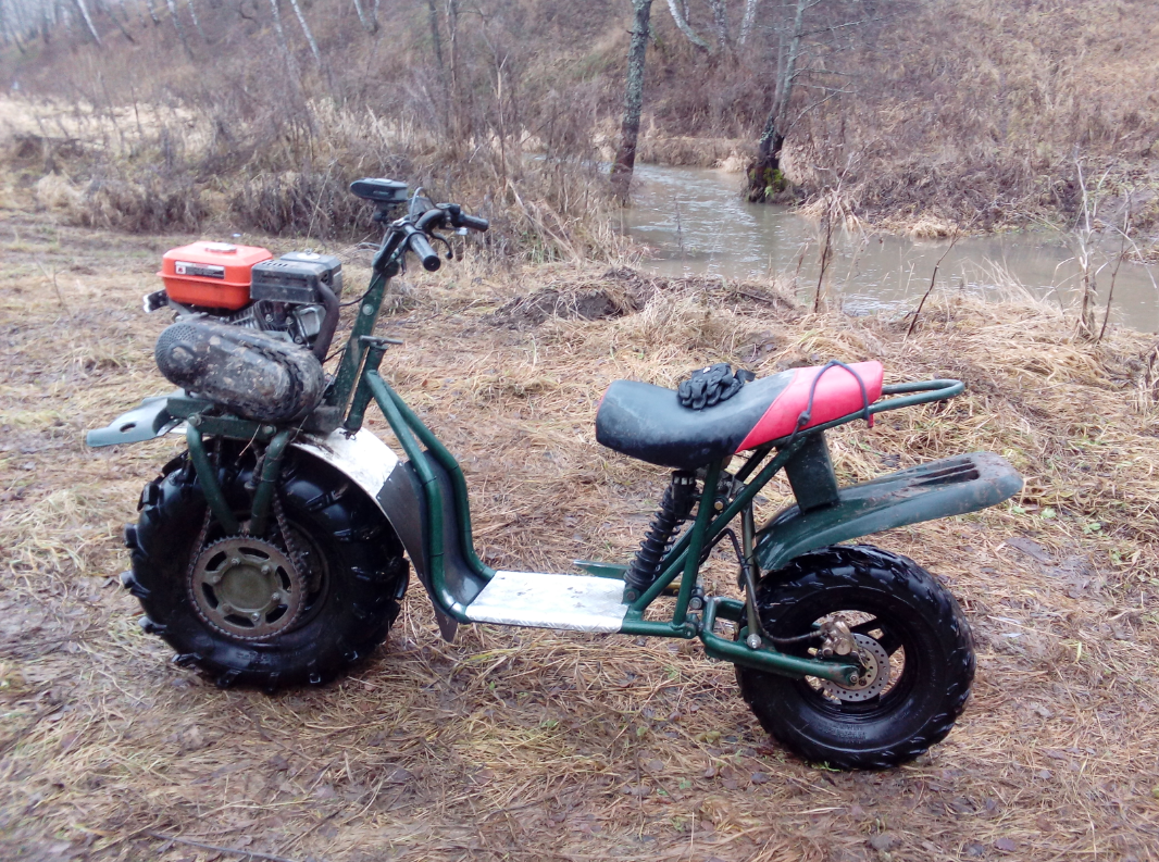 Мой Скаут Сафари Бигфут на фото ниже. Формат - мини, используется круглый год для выгуливания волкособы, перевоза грузов на самодельном прицепе летом и санях-волокушах "сани рыбака" зимой. Двигатель от мотоблока с редуктором позволяет переть по полю с травой "по грудь" напролом, в отличии от квадроцикла - могу ездить по тропинкам и перетаскивать через промоины, благо вес всего 55 кг. Со снятой передней вилкой (открутить 1 гайку, вынуть длинный болт) влезает в Сандеро со сложенными задними сиденьями.