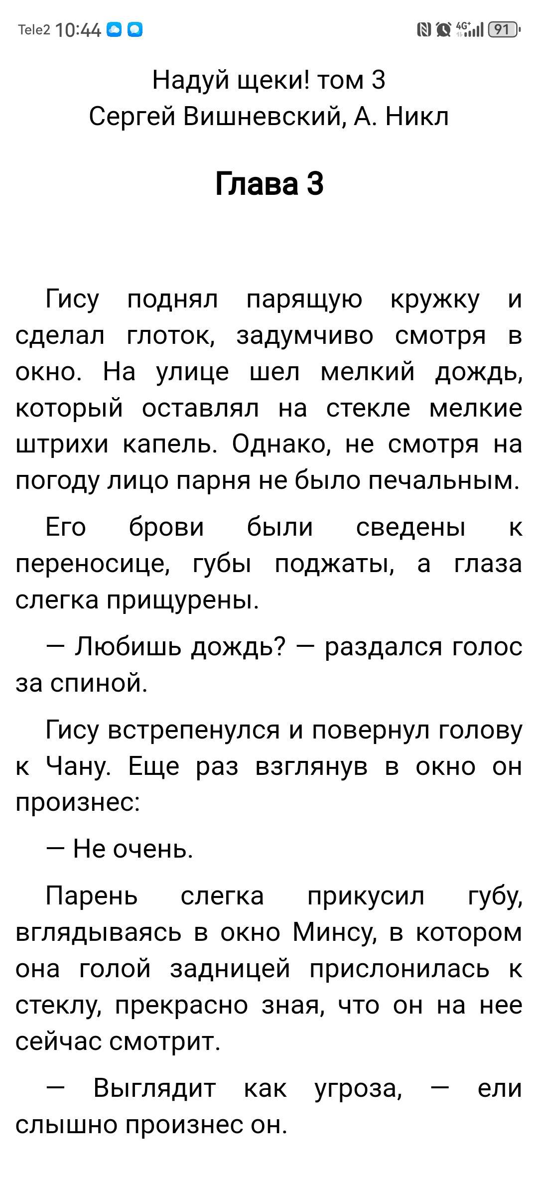 Ошибка в начале 3 главы нужно написать не "Гису поднял парящую кружку", а написать "Гису поднял исходящую паром кружку". А то получается, что он левитирующую кружку поднял). Автор исправь)