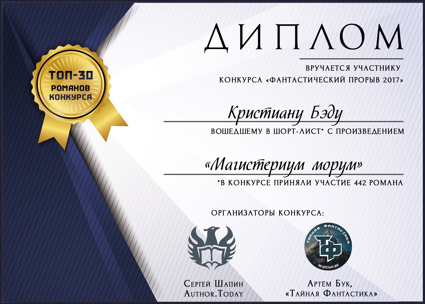 Выдается всем участникам конкурса романов «Фантастический прорыв 2017»