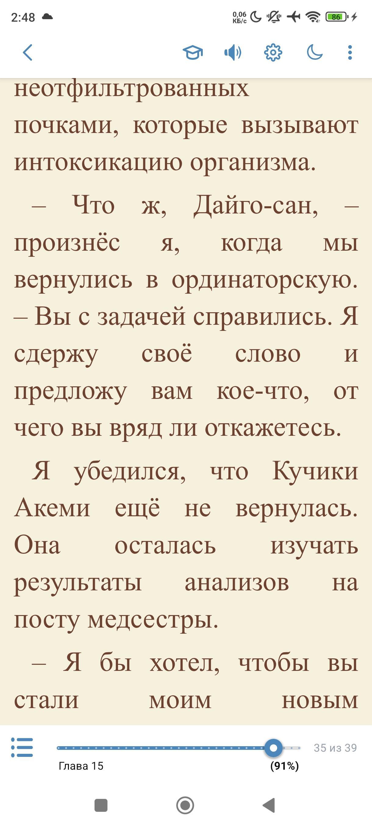 Вот, в конце 15 главы предложение все таки было озвучено и во второй половине 17 главы оно повторяется. Немного другими словами, но все же. А ещё только что заметил, что в приемном отделении, когда пришел парень стажерки, там по тексту звуки борьбы и фраза мол мы уже вызвали полицию и тогда по сути его должны были забрать, а не проспался и ушел по своим делам