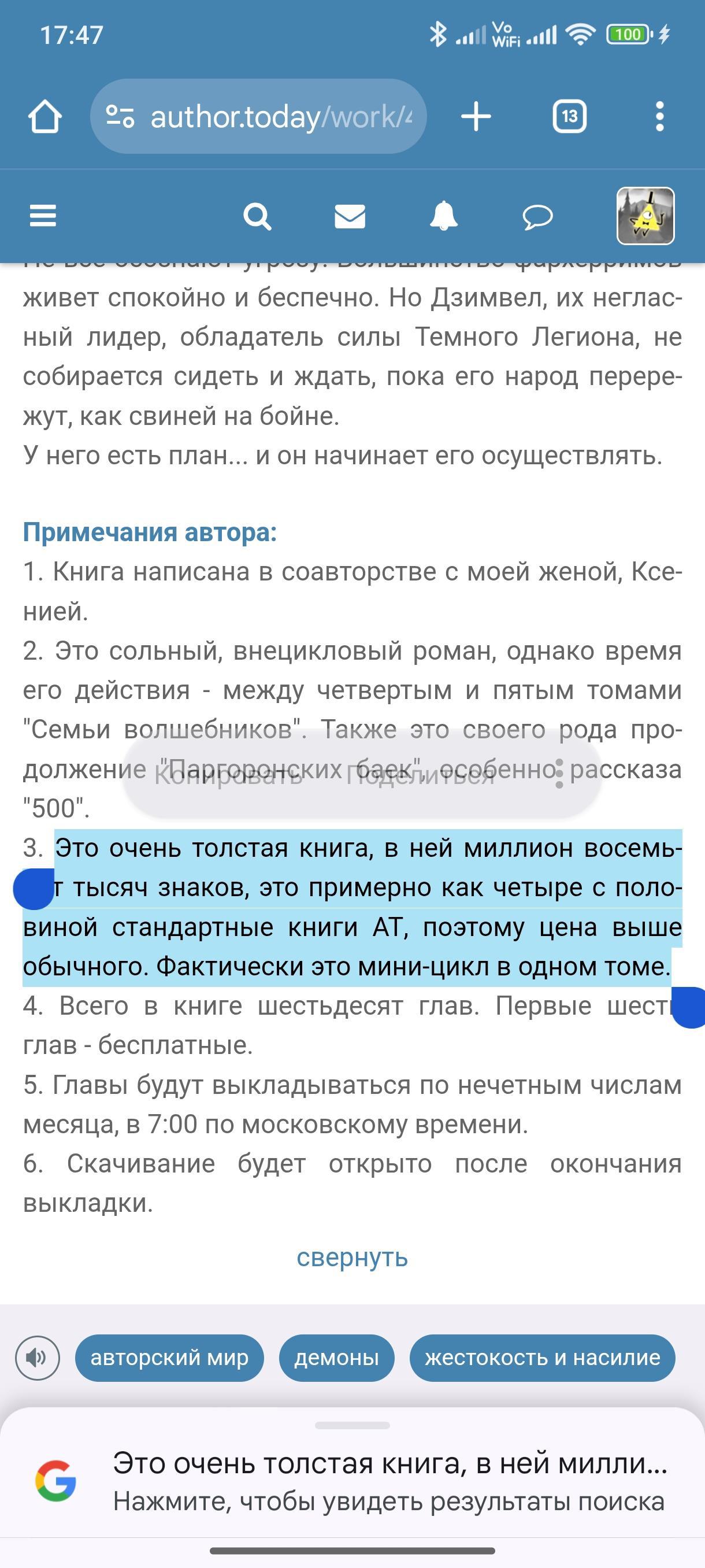"Это очень толстая книга, в ней миллион восемьсот тысяч знаков, это примерно как четыре с половиной стандартные книги АТ, поэтому цена выше обычного. Фактически это мини-цикл в одном томе."