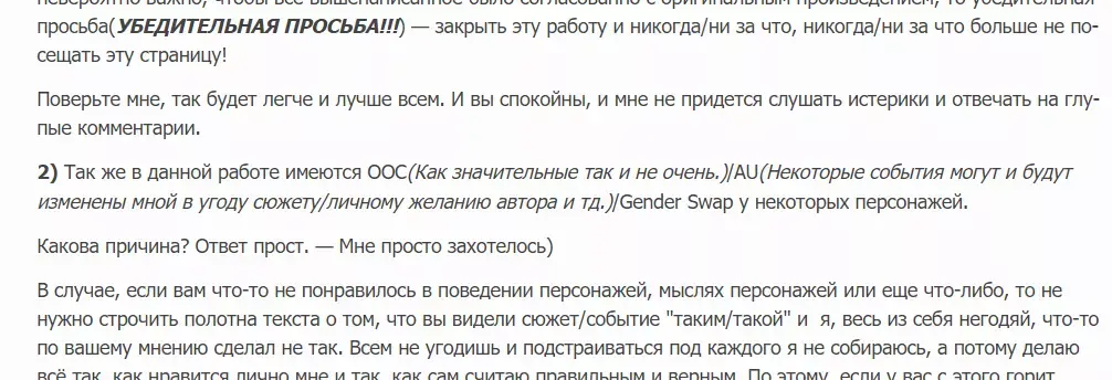В случае, если вам что-то не понравилось в поведении персонажей, мыслях персонажей или еще что-либо, то не нужно строчить полотна текста о том, что вы видели сюжет/событие "таким/такой" и я, весь из себя негодяй, что-то по вашему мнению сделал не так. Всем не угодишь и подстраиваться под каждого я не собираюсь, а потому делаю всё так, как нравится лично мне и так, как сам считаю правильным и верным. По этому, если у вас с этого горит жопа/очко/анальное отверстие/дымоход и/или еще что либо, то опять же УБЕДИТЕЛЬНАЯ ПРОСЬБА не беспокоить ни меня, ни себя тем, чтобы пожаловаться на это в комментариях!