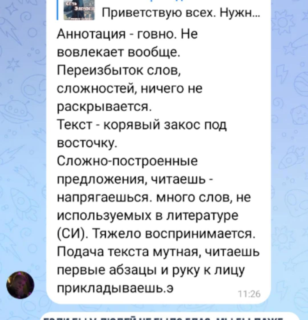 Ну автор молодец что написал. Желаю ему не расстраиваться, у всех бывает. Я вот из за такого как раз не могу романа написать, чувствую что не дотягиваю по своим же меркам то, чего хочу. Просто надо глубже стараться понимать некоторые моменты. Тут не согласен, проблема именно в стиле, в позиции. Под ней ничего не ощущается толкового.