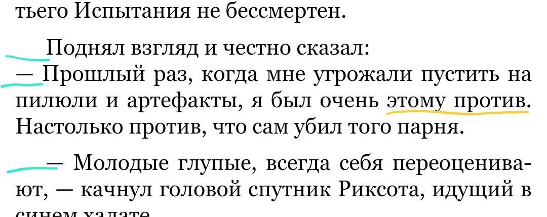 Княжна, геолог и копьё ≈ грамотный, неграмотный и буквы. Типа, а покажи мне тоже пару букв, я такой вумный буду. (хорошо, что Артём и сам понимает, что "пара приёмов" тухлая идея). Как он учится местной магии, конечно, вызывает вопросики, но блин, это не Кеннер, даже, я бы сказала, НЕ Кеннер. У него нет суперохладителя эмоций, нет знакомых Владеющих с соответствующим взглядом на реальность, зато есть высшее образование, которое очень сильно перекашивает мышление в сторону поиска причинно-следственных связей материального толка. Учился бы он в семинарии какой-нибудь, ещё можно было бы рассчитывать на веру в чудеса, а так-то чего от него ждать?