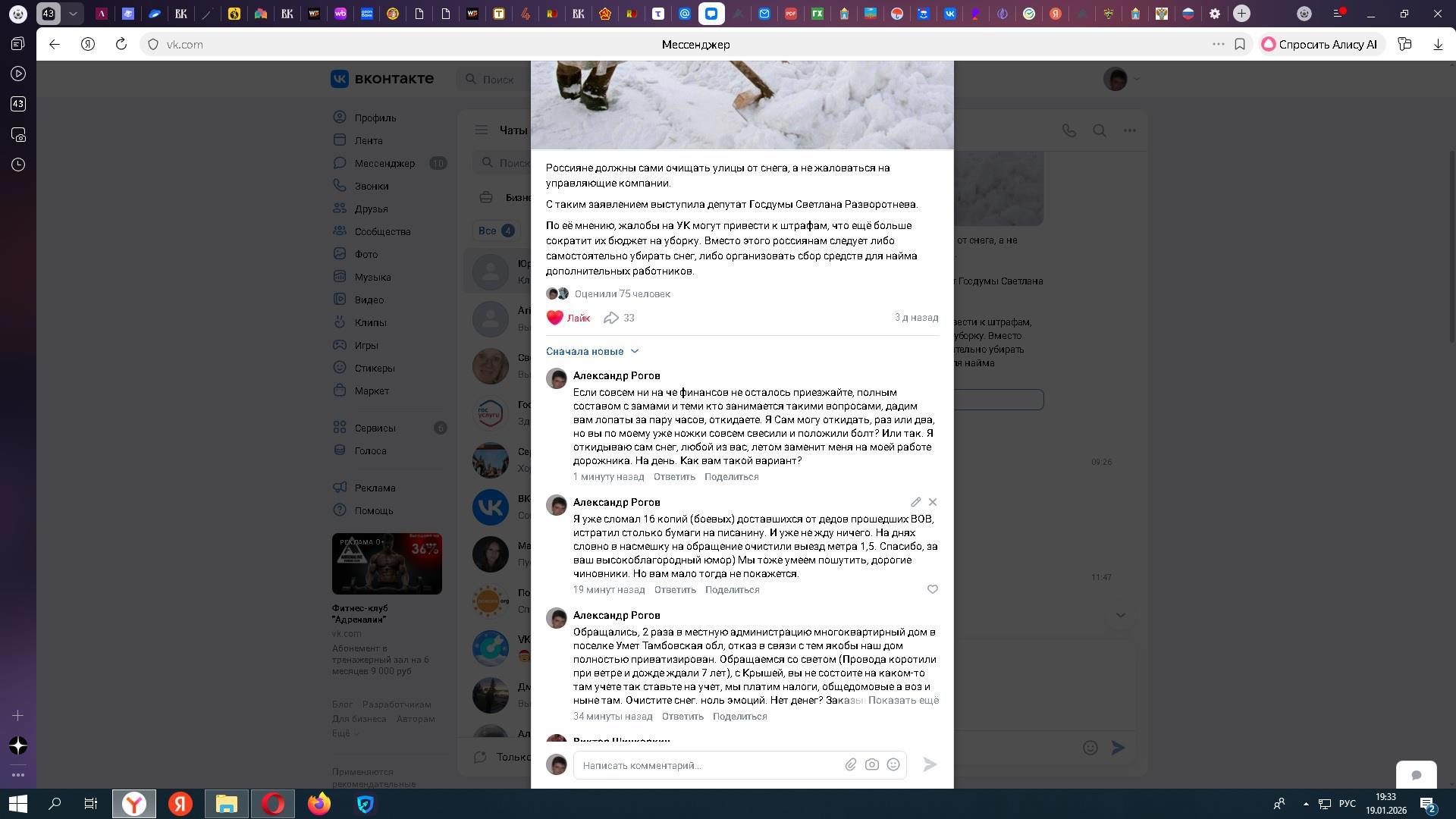 Приведу простой пример, у нас многоквартирный дом, очистка за эту зиму была произведена один раз за счет скинувшихся жильцов дома. Если произойдет пожар, или придется нести тяжело больного его придется нести до дороги, а не во двор а полиция и пожарные не смогут въехать. Я могу сам очистить дорогу лопатой. Но администрация пошевелится лишь когда произойдет трагедия, приедут замы с серьезными лицами, и будут убиваться " ну как же так?". Хотя им наплевать пока их никто не трогает. Поверьте, начальникам в 99% плевать, за что вы оплатите свои коммунальные расходы и что будете кушать) Они захватили нашу жизнь, не чистят, не чинят крышу. Мы зависим от них попробуйте пикнуть, и ваш дом в черном списке).