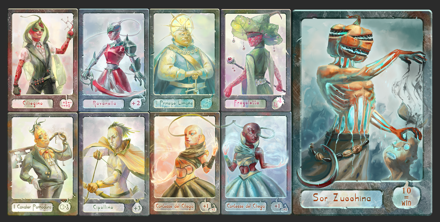 ну это был проект для поступления в один ВУЗ, разрабатывала карточную игру по мотивам Чипполино с закосом персонажей под rpg. По сюжету надо собирать ключи. Там еще в наличии есть несколько персов, книжечка с правилами и еще пара вещей для игры. Сюда просто можно только 25 картинок всего закинуть в галерею, поэтому не все загружала.