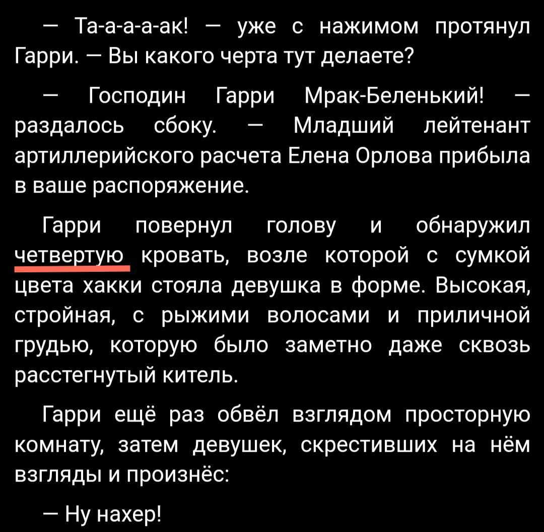 Может уже поздновато, но у меня тут неразбериха какая-то. Орлова в конце третьей главы стоит у четвертой кровати, а в следующей главе речь идёт уже трёх кроватях![]()