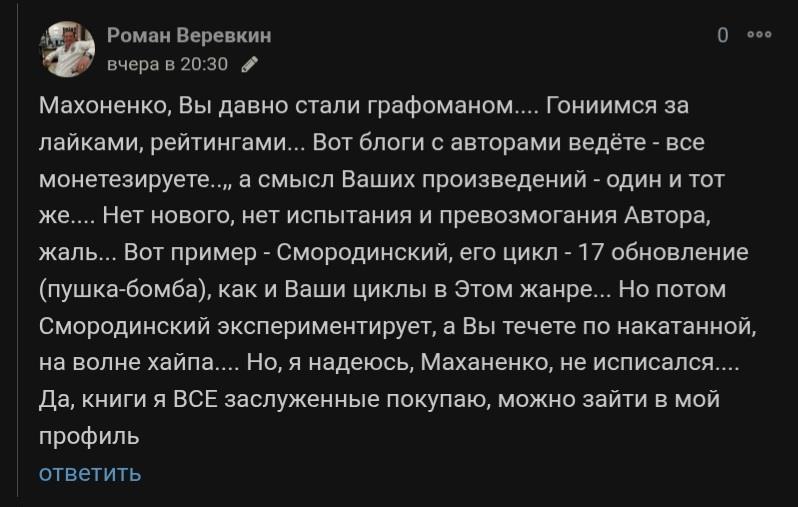 Офтоп : кем автора только не называли . Синопсис, плагиатор, нейросеть , графоман , владелец гарема .,и многое и многое ..но если автору станет легче то ни его одного щас читаю Маханенко ( втч из стрима с ним у вас) и ему тоже прилетает на ровном ... интересно сюла такое прилетит ..если да сообщите в группу это будет весело